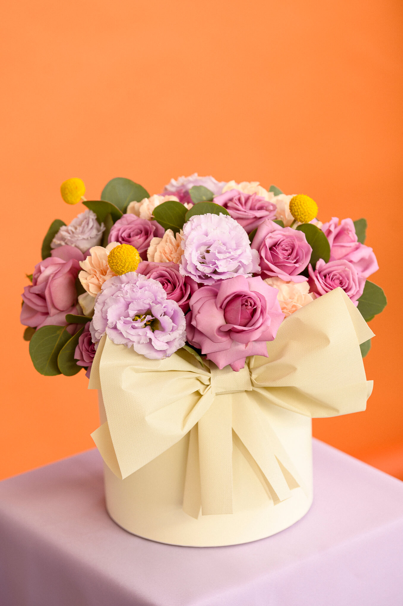 Rosas, lisianthus, craspedia, claveles y follaje fino.